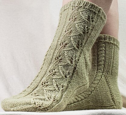 These socks are constructed toe-up with gusset and heel flap shaping. Both charted and written instructions are provided. The leaf panel is mirrored on the left and right socks and alternating cabled ribbing allows a wide range of fit to accommodate even the most stubborn of calves. When selecting a size, pick one with a range that will fit both the desired foot and leg circumferences.
