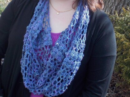 The Spring is Here! Infinity Scarf is a lace infinity cowl, meaning it is in a circle rather than having two ends. The lace sections of the scarf are designed to look like delicate leaf vines waking up after a long winter, taking over the garden once more, and are accented by two solid panels made to look like rose petals.