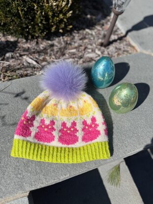 The amounts needed per color are as follows: Worsted weight yarn. Approx. 60(75, 85) yds / 55(69, 78) m of main color. Approx. 35(40, 45)yds / 32(37, 41) m of brim color. Approx. 25(30, 35) yds / 23(27, 32) m of CC1 (chicks). Approx. 30(35, 40) yds / 27(32, 37) m of CC2 (bunnies). Optional: A small amount of dark yarn for the eyes and nose.