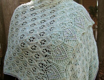 This is a pattern for a delicate lace shawl made using fingering weight yarn. It is comprised of a cable stitch with a lace border. The border can be enhanced with beads, as is shown in the picture. The beads are optional but bead placement is included in the chart. Altogether, it makes a very unusual and exquisite shawl. The two sides are joined by picking up stitches in the center of the shawl.