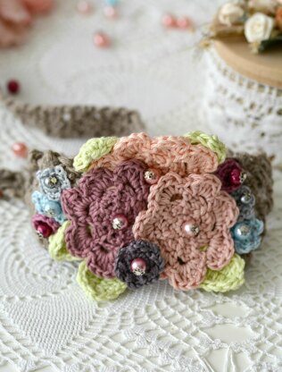 - Embroidery thread in three colours for the small flowers (1.7mm hook) 10 Pearl Beads, 10 head pins, 10 bead caps – round nose pliers and a wire cutter