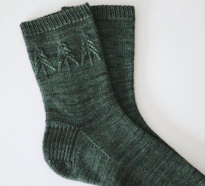 These socks are constructed one at a time from the top, down. Heel is shaped using a heel flap technique. If you are familiar with other sock techniques or have a favorite heel construction, you may easily substitute. Careful attention must be given when you adjust for the heel flap to make sure your tree detailing is positioned on the outer ankle of each sock.