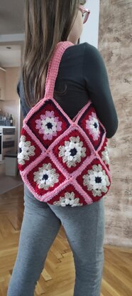 Materials for 13 square: • 390 inches dark blue color yarn (size 4 yarn) – color A • 1599 inches of white color yarn (size 4) – color B • 2158 inches of gray color (size 4) – color C • 3315 inches of red color (size 4) – color D • 1755 inches of pink color (size 4) – color E • 1050 inches for joining parts of the square and bag handles yarn (size 4 yarn) – color E • Hook size US 8/H / 5 mm • Scissors