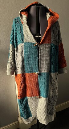 This crochet pattern is for a men's hooded robe made from easy, large crochet squares. As crochet squares are set size, this robe is oversized and off the shoulder, with sleeves that stop short of the wrist. You can make minor adjustments to the size, but there are limited options for adjustment