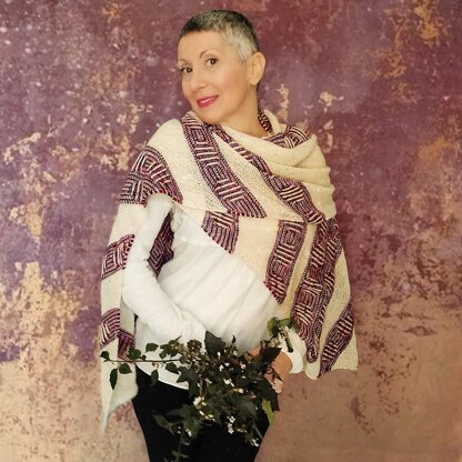 Squaring of the Circle is the latest pattern in my brioche illusion series. This shawl shows an illusion that I find especially intriguing: circles that morphes into squares, i.e. the squaring of the circle, a thing that sounds almost magical. This big stole is worked on the bias with stripes of illusion pattern alternated with relaxing areas of simple garter stitch that are worked in a laceweight yarn. The contrast between the cozy and colorful brioche and the translucent and super lightweight garter stitch makes this shawl unique and also very fun to knit!