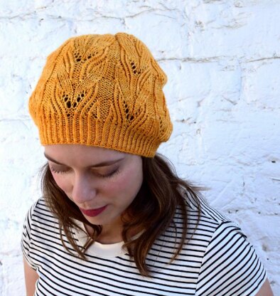 Top your early-autumn outfit with a touch of nonchalant luxury. Squash Blossom Hat features a delicate lace pattern and a slightly slouchy fit. Knitted in the round from the band up.