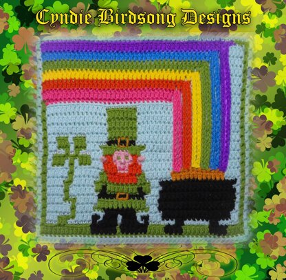 This is a great way to use up scraps! The colors in the sample image were mainly from my scraps stash. Most of the design was done in the A rows (Leprechaun, pot of gold & rainbow), and the A rows used approximate 100 yards total (2 oz) of med weight #4 yarn. The B rows made up the background (sky) and a few small details of the leprechaun, also uses approximate 100 yards (2 oz).