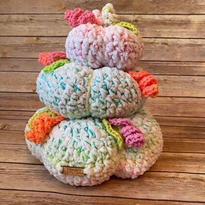 This stacked pumpkin set is perfect for Fall and Halloween. It's made with a super bulky and worsted weight yarn held together. It can be made in any color to match any color scheme you have in your house. You can use a different weight yarn but just be aware that the size of the pumpkin will change. You can leave them apart if you’d like but this pattern is designed for them to be stacked together.