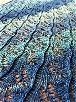 STAGGERED FERNS - an asymmetrical triangular shawl, knitted from side to side. The decreased stitches are placed apart from yo's and form corded ribs that are gently curved to right. Yarn over pattern makes simple fern. Multiple repeats of the gauge 10 sts x 10 rows creates staggered pattern. Easy to memorize: after couple repeats it allows to distant yourself from the written pattern. The shawl could be ended after any 10 rows repeat. So, if you have just one skein of yarn around 400 yards, make a little shawlette, or good size shawl 75 inch x 22 inch with 2 skeins. Fringes could be added to the taste of the knitter.