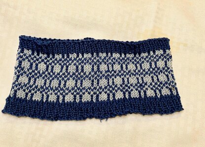 Stained Glass Ear Warmers are an easy stash busting piece for a multi color effect or done in solids for a more classic look. With a simple six stitch square chart it is easy to remember and knits up quickly. It takes about 150-160 yards of the main color and 50-60 yards of the accent color.