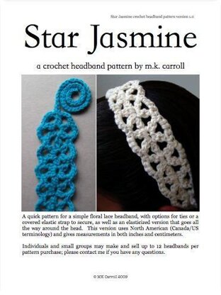 A quick pattern for a simple floral lace headband, with options for ties or a covered elastic strap to secure. Sample shown in photo is a Small on a Medium head – the pattern has been sized so that the ends of the band fall behind the ears. Please let your own personal preference determine your choice of size and lengthen or shorten the ties/elastic band to your own level of comfort. Individuals and small groups may make and sell up to 12 headbands per pattern purchase; please contact me if you have any questions.