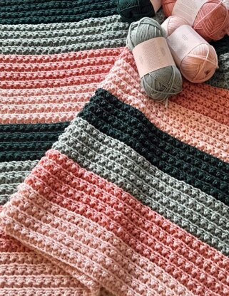 • DK light worsted weight merino – Sample used Sandnes Garn Merinoull 100% Merino 8ply, 4 x 50-gram skeins of each color for main blanket, plus 100 grams for the edging – 900 grams (approx. 2050 yards) • Crochet hook size H (5.0 mm)