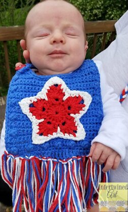 The bib itself measures appx 6.25 inches across by 5.5 inches in length, and the neckstrap can be buttoned through any stitch, making it adjustable from newborn to toddler neck size up to about 11.5 inches around. Additional 4 inches of length from fringe.