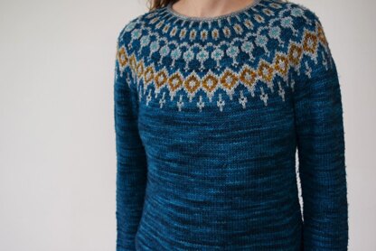 Starfall is worked seamlessly and in the round. The body and sleeves are knit first, with optional stranded colorwork motifs at the hem and cuff, followed by subtle waist shaping. After joining for the yoke, short row shaping is worked on the back of the sweater. Last but not least is the stranded colorwork yoke! The options for color combinations are endless, calling for 4 colors, or you can simplify and make a 2 or 3 color version. Light worsted or DK weight yarn. Designed to be worn with positive ease. For a closer fit 1-2” (2.5-5 cm), for a standard fit 3-4” (7.5-10 cm) positive ease.