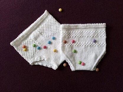 Sizes: to fit ages 0-6 months (6-12 months). Materials: Sirdar Snuggly 4 ply: 1(1) x 50 g ball [226 m/247 yds]; pair 3¼ mm needles; 2½ mm crochet hook; waist length elastic. Tension: 28 sts and 36 rows to 10 cm over stocking stitch using 3¼ mm needles.