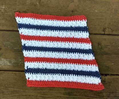 This washcloth can be made with just one ball of worsted cotton yarn. I show two versions – one with the patriotic stripes and another in a solid color but with a contrasting color for the edging.