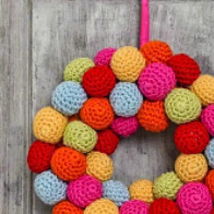 . This bright bauble wreath would look fabulous hung on your front door on a wall in the craft room. Each bauble is made separately then glued to a foam wreath. Yardage will vary depending on how many baubles you decide to make. Each bauble uses only small amounts of yarn, making this an ideal stash buster. You could choose colours to suit the season (eg Christmas) or to suit your home decor. No tension is given, please make your first bauble and then check the weave is tight enough that your stuffing won't poke through. Adjust your hook size accordingly. The pattern is written in UK crochet terms and is suitable for a beginner who is able to work in rounds / spirals using double crochet. A number of cotton yarns have been suggested, you will at least 6 colours to make a really colourful wreath - but you won't need the whole ball! Raid your stash and choose complementary brights, subtle neutrals or any combination you like.