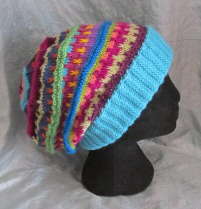 This is a pattern for a textured loose-fitting slouch hat or beanie using scraps of different coloured yarn. This is a great stashbuster pattern!
