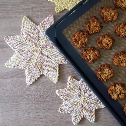 Christmas is the time to decorate the space around you with pretty things. These 8-pointed stars can be used as hotpads, doilies or coasters. They are knitted in one piece and all in garter stitch – starting with a provisional CO, then point by point around the center. Grafting the first and last rows together gives it a seamless look. The construction uses short rows and basic increases and decreases.
