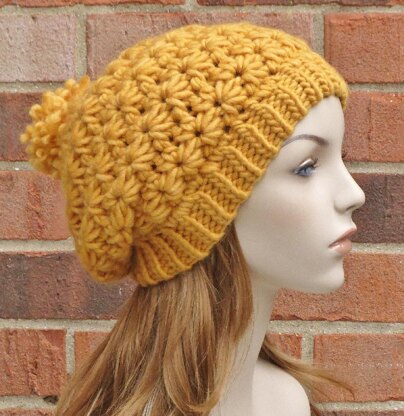 Stella is an ultra-cozy, stylish winter hat pattern featuring a bold and chunky star stitch pattern, a snug knit-look brim, and a fluffy pom pom on top! This hat is sure to keep you snuggly warm on cold winter days, and will add stylish flair to any outfit! This pattern contains helpful, clear photos and easy to follow, detailed instructions.
