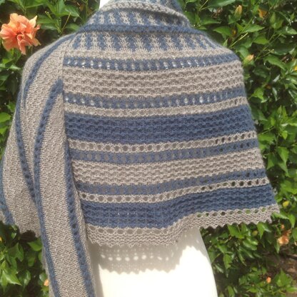 Shawl is a vortex shape which measures 61"/155cm at top edge; 81"/205cm at left edge; 73"/185cm at right edge; 21"/53cm deep. Pattern calls for Sport weight or light DK in two solid colors; approximately 328 yds for main color, and 415 yds for contrasting color. Pattern is mostly charted with detailed instructions for working from a chart.