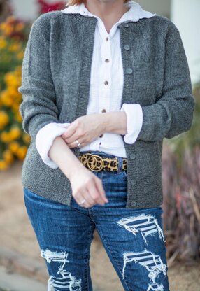 Written in an easy to follow step by step format, this top-down cardigan starts with the ribbed collar. Once the collar is done you work GSRs for neck shaping then move into simple raglan increases. After separating for sleeves, the body is continued in stockinette then has a deep garter band for the hem. Picking up for the button band is a breeze. Then you will work the sleeves in the round down to the ribbed cuff.