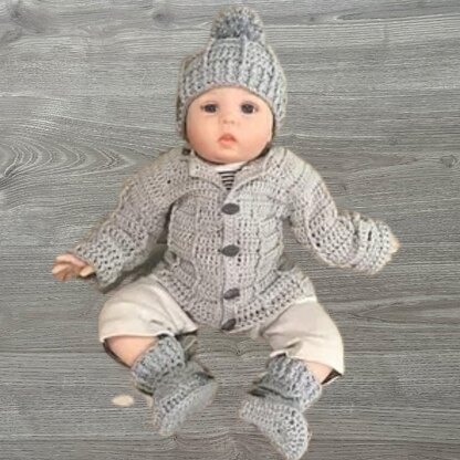 A coordinated crochet baby set pattern for 0–3 months featuring a cardigan, hat and booties worked with classic ridged texture. The cardigan and hat are worked seamlessly top down with no side seams, and the booties are worked in the round from the bottom up sized by hook, ideal for everyday wear, baby photos and thoughtful handmade baby gifts.
