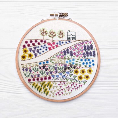 Beautiful, Colourful and Fun Hand Embroidery Designs Discover your next stitch journey.\n\nHere at Stitchdoodles we are all about creativity. Sitchdoodles was created in 2019 after I was finding it difficult to find hand embroidery patterns that were exciting and a bit different from the usual. Wanting to combine our love of hand embroidery stitches, traditional sampler techniques as well as quilt designs(!) I decided to come up with something myself and it has evolved into an array of wonderful and colourful designs that will hopefully inspire and excite people to pick up a needle and get 'happy stitching’.\n\nWhat you will receive:\n• This pattern is available as a PDF download so you can access the pattern as soon as you would like.\n• Each pattern comes with details on the colors, threads, and materials required.\n• Easy to follow instructions are given along with full-color photos.\n• All templates are provided actual size.\n\nFlower Meadow Cottage Hand Embroidery Pattern - a beautiful Hand Embroidery design where you can get lost in all the gorgeous colours and stitches found in the meadows that lead to the cottage\n\nThe Flower Meadow Cottage Hand Embroidery Pattern details the floss and stitches I used in the example photo but feel free to make your own choices – it’s up to you! The design when completed fits a 7 inch hoop.