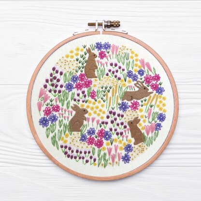 Beautiful, Colourful and Fun Hand Embroidery Designs Discover your next stitch journey.\n\nHere at Stitchdoodles we are all about creativity. Sitchdoodles was created in 2019 after I was finding it difficult to find hand embroidery patterns that were exciting and a bit different from the usual. Wanting to combine our love of hand embroidery stitches, traditional sampler techniques as well as quilt designs(!) I decided to come up with something myself and it has evolved into an array of wonderful and colourful designs that will hopefully inspire and excite people to pick up a needle and get 'happy stitching’.\n\nWhat you will receive:\n• This pattern is available as a PDF download so you can access the pattern as soon as you would like.\n• Each pattern comes with details on the colors, threads, and materials required.\n• Easy to follow instructions are given along with full-color photos.\n• All templates are provided actual size.\n\nThis Wild Flowers and Rabbits Hand Embroidery Pattern - it is a beautiful embroidery design featuring gorgeous wildflowers such as thistles, bullrush, and daisies intermingled with grasses and leaves as the wild rabbits pass through!\n\nThe pattern details the floss and stitches I used in the example photo but feel free to make your own choices – it’s up to you! The Design is approximately 7x7 inches.