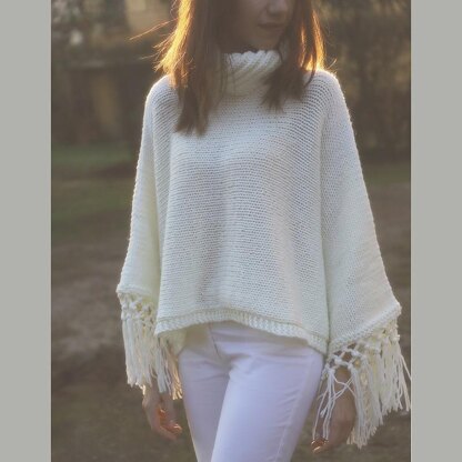 This poncho is made of 2 rectangular panels seamed together, plus a bonus cowl. Stitches used are: stockinette stitch, garter stitch, ribbing and fisherman's rib for the cowl.