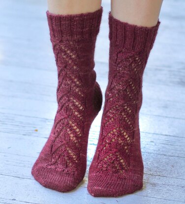 Pebbled eyelet increases grow in in a pointed pattern that run down the front of the sock. A firm gauge is used for optimum wear and crisp stitch definition.