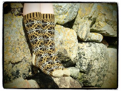 Stoorbra socks are one size over socks suitable for wearing at home in front of the fire as the days get shorter and the nights draw in. They can be used as boot socks but are not intended for everyday use as Shetland wool will not withstand daily wash and wear. I have chosen unbleached, organically dyed Shetland wool from Uradale which is very soft and reflects the colours of Shetland. The socks, shown in two colourways, are worked from the top down, with a traditional heel flap.
