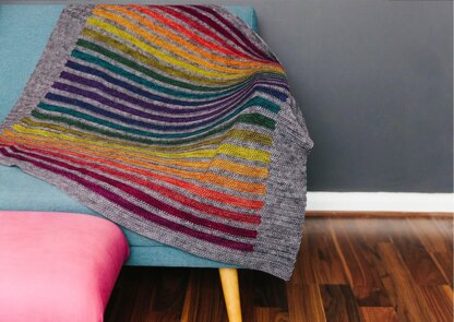 The blanket is a mirror image, initially working through 12 (20g rainbow mini skeins) or 6 (50g variegated yarn) contrasting colours, and then mirroring these colours from the centre out.