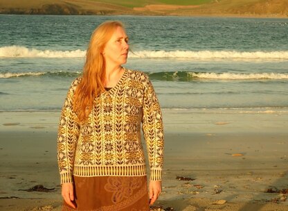 The Stovenswala is a traditional Shetland gansey designed with vertical panels of different sizes. The main motif is positioned so that it runs continuous up the front and back to join at the shoulders. The spaces down the sides and underams are filled with a seed pattern. This small repeat pattern makes it easier to alter the size of the gansey without affecting the main motifs. The gansey features full length sleeves and a V neck. It is made in 100% Shetland wool using four natural shades and four dyed shades.