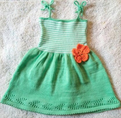 This is a baby dress pattern. It is about 17 inches long and fits 0-12 months old babies. It is suitable for beginner machine knitters.