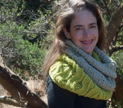 Strata is a cowl inspired by the striations of color in the rocky cliffs and sandy beaches along the Northern California coast. Strata has two versions: Mountain and Sand. Depending on the yarn thickness and colors you choose, you can achieve dramatically different, but equally stunning results. The Mountain cowl, designed with one color of bulky yarn, is a bold, quick knit. The Sand cowl, designed with two low-contrast colors of sport weight yarn, is more delicate. Both Mountain and Sand are knit in the round in helical stripes (like the stripes of a barber pole) to create a seamless cowl that’s beautiful even on the “wrong” side.