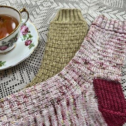 These socks have some interesting vertical texture without being complicated, and the patterning works well with variegated or tonal yarns. The pattern is easy to memorize once it is established, so it’s perfect for TV/movie knitting or for chatting during knit nights!