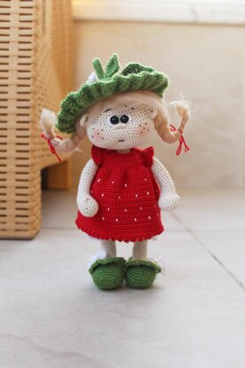 Crochet STRAWBERRY doll pattern is in PDF format in English (US terms) language. Crochet level: medium The pattern consists of 20 pages and is accompanied by more than 50 photographs. The finished product using the materials stated in this pattern is ~8.6 inches / 22 cm in height without the hood. The doll is crocheted as one piece with the wireframe. It can move the legs and arms. The eyes, nose, and ears are sewn. All clothes are removable. The pattern includes the doll + set of clothes (cap, dress, pants and shoes).