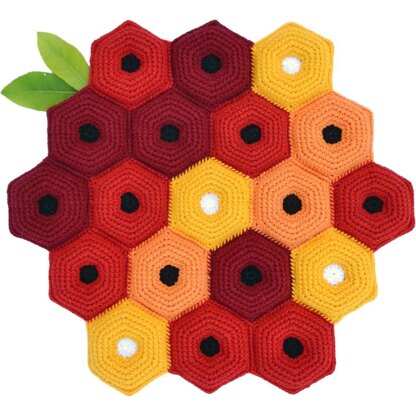 Strawberry Danish is soft, textured, 3-dimensional cushion made of stuffed crochet hexagon tiles. Each hexagon motif consists of two sides (crocheted separately) with a common center, then it is stuffed and the sides are joined.