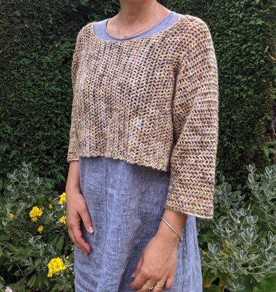 An airy top with lots of textural interest, while remaining cool and lightweight! With its minimalist look is great layered either over a tank top, a dress, with jeans or a maxi skirt. This summer top worked flat, sideways in one piece to minimize seaming. Quick and easy to do, this is the perfect project for a beginner.