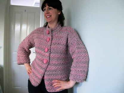 A boxy jacket in a simple 4 row textured stitch - an easy knit even for beginngers. And no borders to sew on.