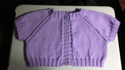 This shrug is made top down with sleeves picked up later. It goes well with the Stretchy Toddler Leggings. The yarn used has 7% elastic.