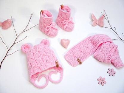 Das entzückende Set aus Mütze, Schal und Schühchen hat weit mehr als nur eine unwiderstehlich niedliche Bären-Optik zu bieten. Das Marra-Zwergenset besticht durch sein umwerfendes Muster und die praktischen Ohrenklappen halten Wind und Zugluft auf Abstand. Praktische Bindebänder garantieren einen stets einwandfreien Sitz der Mütze, aber auch der Schühchen.