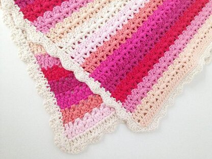 This lovely baby blanket makes a wonderful gift. It is 20 inches wide and 26 inches long. In this pattern you'll find the following instructions: how to make this pattern / the amount of yarn you need / how to change the size of this pattern. To make this pattern, you need to know how to make a chain, slip stitch, single crochet, half double crochet, double crochet. This pattern is written in US crochet terms. I used Drops Paris Cotton and a crochet hook size 4mm (US 7) for this pattern in the colors: off white, peach, medium pink, red, heather, shocking pink, apricot and light light pink. Rico Creative Cotton Aran is a very good alternative but please note that the colors I suggested of this yarn are a little different then the blanket I made.