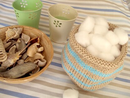 This is a pattern for a Striped Container. It is knitted flat with a seam, and the base is made by simple increases. This would be fine for a beginner. Yeoman Cotton DK is sold on 400 gm cones, the equivalent in 50 gm balls is given in the yarn amounts. Any dk cotton can be used. It is used doubled. Also available in a Create Space book on Amazon A Day at the Seaside, in paperback or for Kindle.