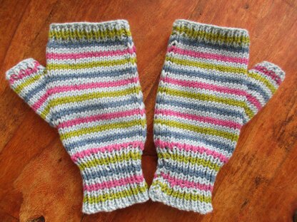 This is a pattern for striped fingerless gloves, originally published in Knitting magazine. They have a thumb and no fingers, and a ribbed edge. They are knitted in the round on double pointed needles or a circular needle.The yarn is a dk.