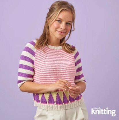This is a pattern for a stripes and border jumper, originally published in Simply Knitting. It is worked in stocking stitch with an intarsia border with bobbles, 2 x 2 rib edges and raglan sleeves. Photos Simply Knitting.