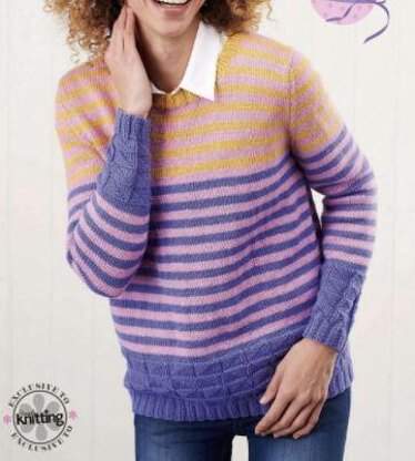Flags and Stripes Jumper is a simple garment in stocking stitch stripes with a knit and purl texture stitch on the borders. It is fine for beginners who can do basic shaping. Photo Simply Knitting.
