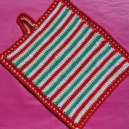This is an original pattern for a colourful double thickness potholder with a stripey pattern on the front. The reverse is plain red, and both thicknesses are joined by a double row of crochet in red with white spots.