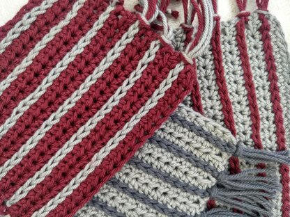 This simple pattern uses overlay/surface crochet to create simple, bold stripes. The pattern includes a video tutorial showing how to do the overlay technique. My total yardage for 4 coasters was approximately 133 yards, and the final size of the coasters is about 4.25" by 5.5" excluding fringe.